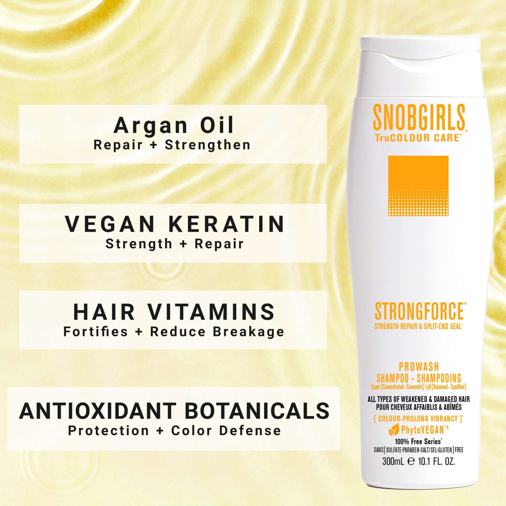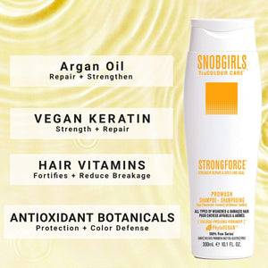 Meet your strength-repair essential for weak, overprocessed, breakage-prone, or split-end-damaged hair. The STRONGFORCE Duo pairs our super-concentrated Vegan Shampoo with the Vegan Conditioner to gently cleanse, reinforce fragile strands, and help stop snap-breakage before it starts—without weight, residue, or buildup. Together, they rebuild resilience, smooth roughness, enhance elasticity and shine, and help keep color looking rich and fresh.