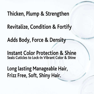 Enriched with Red Clover, Ginseng, Ceramides, Peptides, Hyaluronic Acid, Biotin, and essential vitamins, it revitalizes and fortifies hair. Ideal for achieving visibly fuller, plumper, and more resilient hair.